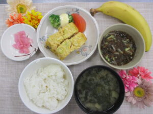 五目厚焼玉子 今日のランチ&おやつ♪ 2023.07.19 本日の昼食は「五目厚焼玉子」でした♪ エビ・長ねぎ・しいたけ・たけのこ・グリンピースが入っています!しいたけとたけのこは下煮をしてあるので、味もしっかりしていて、ご飯のおかずになります😊 副菜には「もずく酢」をお出ししました!生姜と酢が効いていて、さっぱりと頂くことができました😊 ★本日のランチメニュー&おやつ★ 五目厚焼玉子 味噌汁(なす・ほうれん草) もずく酢 さくら漬け おやつ:バナナ🍌