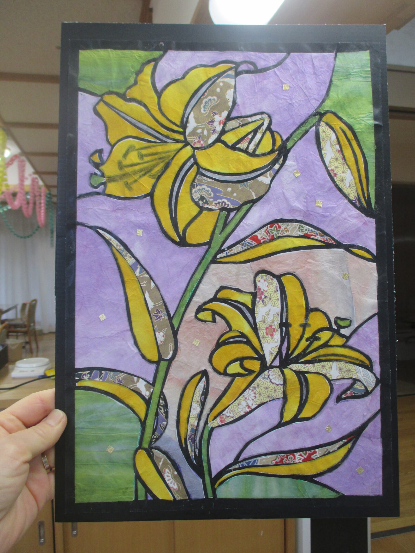 大きさはA3サイズ、色を単調にせず、あえて 柄和紙を入れると絵に深みが加わります。
