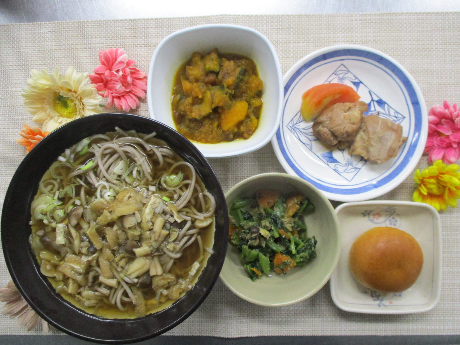 田舎風そば♪ 今日のランチ&おやつ♪ 2025.09.18 本日の昼食は田舎風そばでした😊 しめじ、まいたけ、油揚げ、ネギを乗せた具沢山のおそばです🌟 ★本日のランチメニュー&おやつ★ 田舎風そば 〈粥〉鶏のやわらか煮 かぼちゃのいとこ煮 小松菜の生姜醬油和え 薄皮ピーナツパン