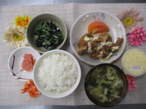 チキン南蛮🐔 今日のランチ&おやつ♪ 2025.10.01 本日の昼食はチキン南蛮でした♪ 揚げた鶏肉に南蛮タレをからめて、タルタルソースをかけてお出ししました😊 甘辛い唐揚げとタルタルソースの相性は抜群で、ご飯が進む一品になりました✨ ★本日のランチメニュー&おやつ★ チキン南蛮 卵スープ ほうれん草のシラス和え 桜つぼ漬け カスタードプリン🍮