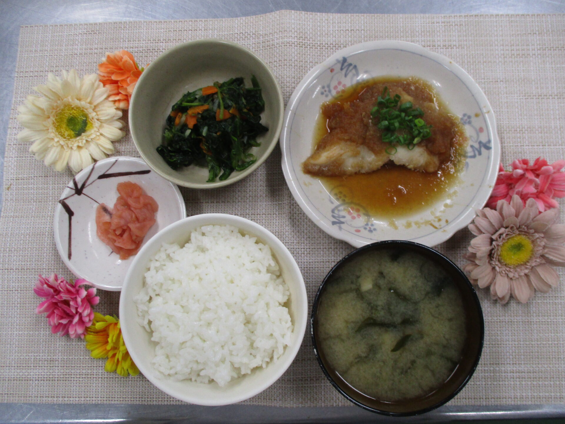 鮭のみぞれ蒸し🐟 今日のランチ&おやつ♪ 2025.10.30 本日の昼食は鮭のみぞれ蒸しでした😊 鮭の上に醤油で味付けをした大根おろしを乗せ、蒸し焼きにした一品です♪ ★本日のランチメニュー★ 鮭のみぞれ蒸し 味噌汁(小松菜、えのき) ほうれん草の三色和え物 桜つぼ漬け