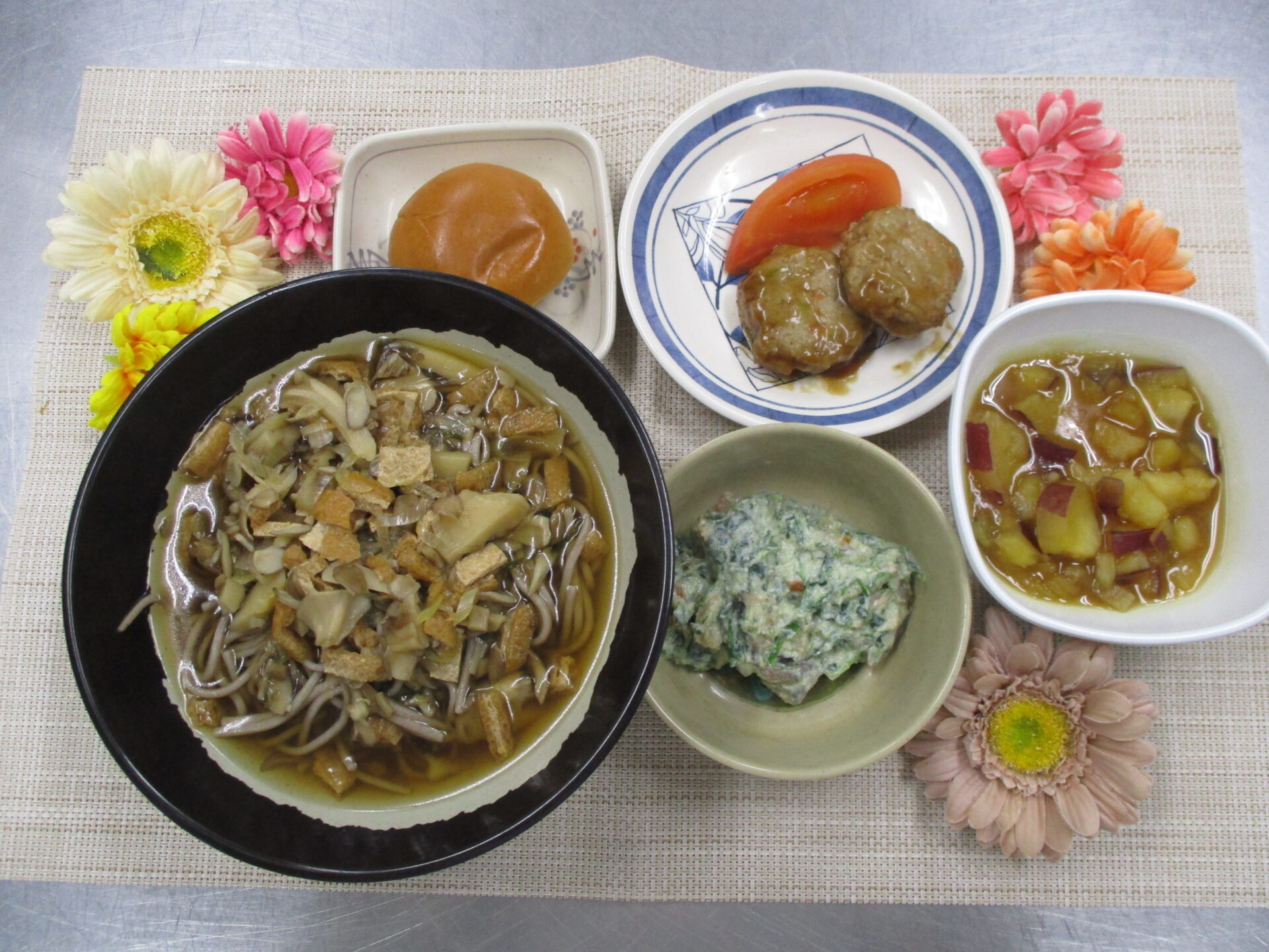 きつねそば🦊 今日のランチ&おやつ♪ 2025.11.05 本日の昼食はきつねそばでした♪ ★本日のランチメニュー&おやつ★ きつねそば 〈粥〉野菜入り鶏つくね さつまいもの煮付 ほうれん草の白和え 薄皮チョコパン