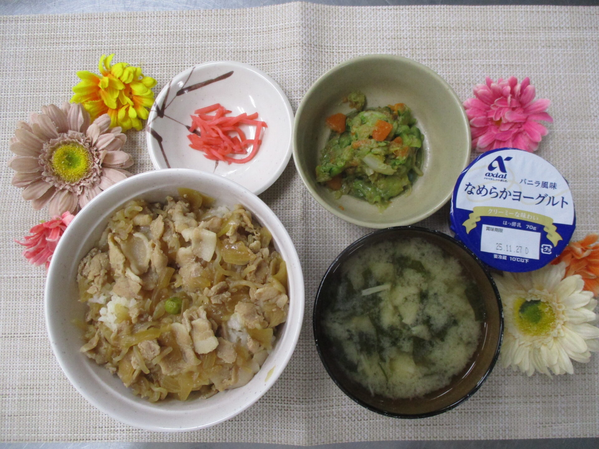 豚丼🐷 今日のランチ&おやつ♪ 2025.11.19 本日の昼食は豚丼でした😊 甘じょっぱい味付けの豚丼は食べごたえがある丼です♪ ★本日のランチメニュー&おやつ★ 豚丼🐷 味噌汁(小松菜、えのき) キャベツの土佐和え 紅生姜 ヨーグルト