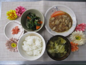 鶏肉のオニオンソテー🐔 今日のランチ&おやつ♪ 2025.12.10 本日の昼食は鶏肉のオニオンソテーでした😊 すりおろした玉ねぎで作ったソースを焼き上げた鶏肉にたっぷりかけました♪ おやつにはチーズケーキをお出ししました🧀 ★本日のランチメニュー&おやつ★ 鶏肉のオニオンソテー 卵スープ ほうれん草の三色和え物 桜つぼ漬け チーズケーキ