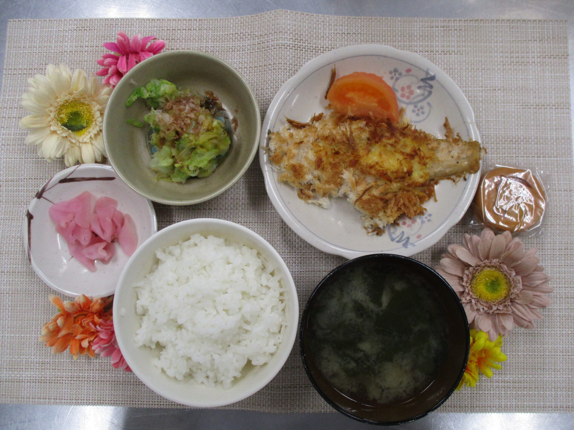鮭のマヨパン粉焼き🐟 今日のランチ&おやつ♪ 2026.01.07 本日の昼食は鮭のマヨパン粉でした😊 マヨネーズを塗った鮭にパン粉を乗せ、オーブンで焼き上げました♪ ★本日のランチメニュー&おやつ★ 鮭のマヨパン粉焼き 味噌汁(小松菜、しめじ) キャベツのお浸し さくら漬け 干支おやき