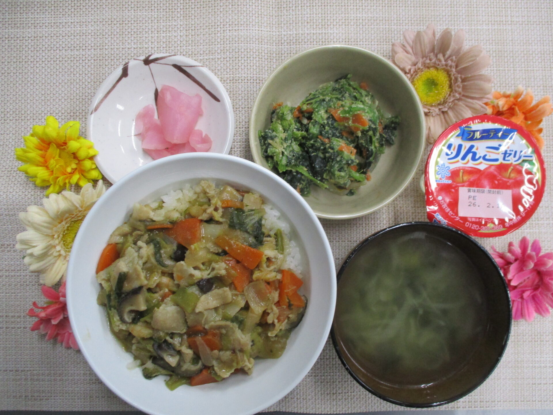 中華丼♪ 今日のランチ&おやつ♪ 2026.02.04 本日の昼食は中華丼でした😊 エビや豚肉、白菜、青梗菜、玉ねぎ、人参と沢山の具が入った中華丼です♪ ★本日のランチメニュー&おやつ★ 中華丼 わかめスープ ほうれん草の三色ゴマ和え さくら漬け りんごゼリー🍎