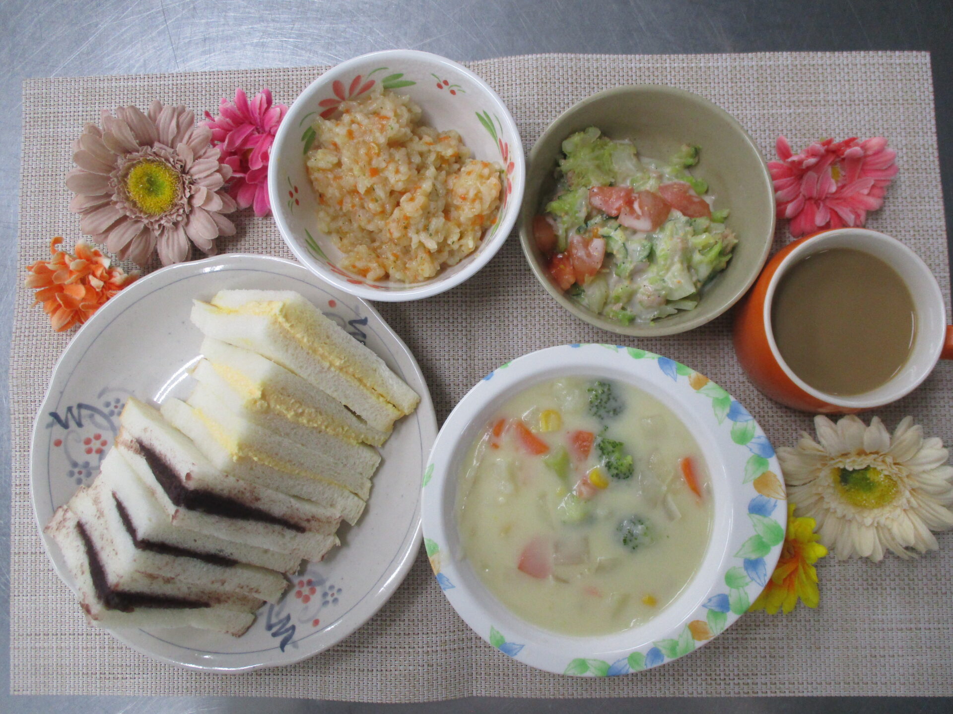 サンドイッチ🥪 今日のランチ&おやつ♪ 2026.02.05 本日の昼食はサンドイッチ🥪でした♪ たまごとあんこをたっぷり挟んだサンドイッチです😊 クリームシチューもまろやかで、利用者様にも人気のメニューです✨ ★本日のランチメニュー★ サンドイッチ(卵、あんこ) 〈粥〉野菜リゾット クリームシチュー ツナサラダ コーヒー牛乳
