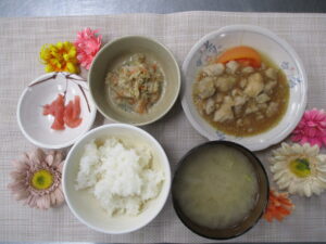 鶏肉のオニオンソテー🐔 今日のランチ&おやつ♪ 2026.02.10 本日の昼食は鶏肉のオニオンソテーでした♪ すりおろした玉ねぎに醤油、砂糖、みりんで味をつけた ソースを、鶏肉と合わせて仕上げた一品です😊 おやつには手作りチョコレートプリンをお出ししました🍫 ★本日のランチメニュー&おやつ★ 鶏肉のオニオンソテー 味噌汁(大根、長ネギ) もやしのゴマ和え 桜つぼ漬け 手作りチョコレートプリン🍫