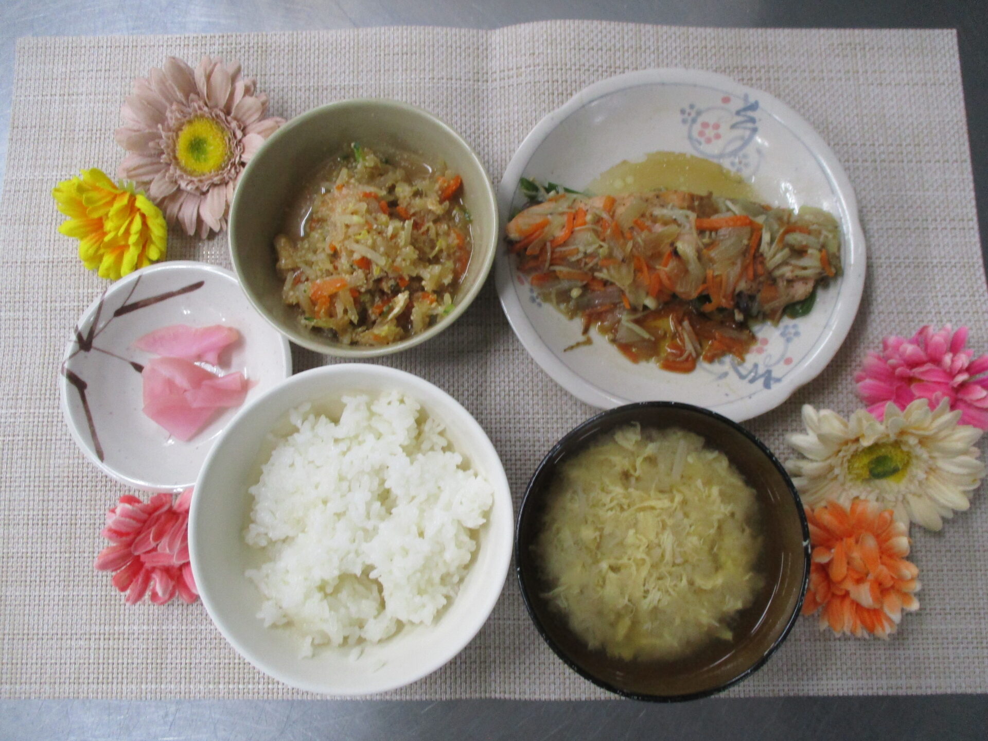 鮭の鉄板焼き🐟 今日のランチ&おやつ♪ 2026.02.16 本日の昼食は鮭の鉄板焼きでした♪ にんじん、玉ねぎ、ピーマン、えのき、しいたけを たっぷり乗せてバター醤油で味付けした一品です😊 おやつにはチーズケーキをお出ししました✨ ★本日のランチメニュー&おやつ★ 鮭の鉄板焼き 味噌汁(卵、えのき) もやしのゴマ酢和え さくら漬け チーズケーキ