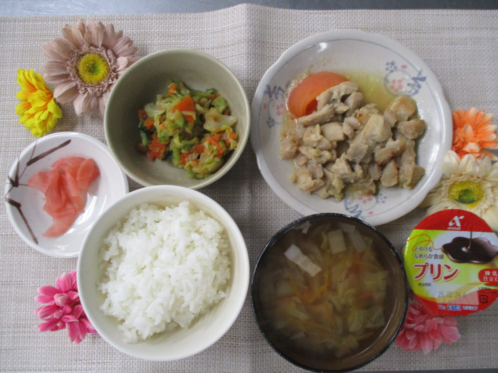 鶏肉の味噌漬け焼き🐔 今日のランチ&おやつ♪ 2026.02.17 本日の昼食は鶏肉の味噌漬け焼きでした😊 味噌につけて味をしみこませた鶏肉をオーブンで焼き上げました♪ ★本日のランチメニュー&おやつ★ 鶏肉の味噌漬け焼き 野菜スープ キャベツの土佐和え 桜つぼ漬け プリン🍮