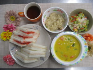 サンドイッチ🥪 今日のランチ&おやつ♪ 2026.02.20 本日の昼食はサンドイッチ🥪でした♪ ★本日のランチメニュー&おやつ★ サンドイッチ🥪(ツナ、イチゴジャム) 〈粥〉ツナリゾット かぼちゃシチュー 三色サラダ ストレートティー