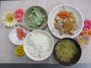 鶏肉の和風ソテー🐔 今日のランチ&おやつ♪ 2026.02.24 本日の昼食は鶏肉の和風ソテーでした♪ おやつには手作り牛乳プリンをお出ししました🥰 イチゴジャムで作ったソースがさっぱりしていて プリンによく合いました🎀 ★本日のランチメニュー&おやつ★ 鶏肉の和風ソテー 味噌汁(キャベツ、長ねぎ) 小松菜のゴママヨ和え 桜つぼ漬け 手作り牛乳プリン(イチゴソース)