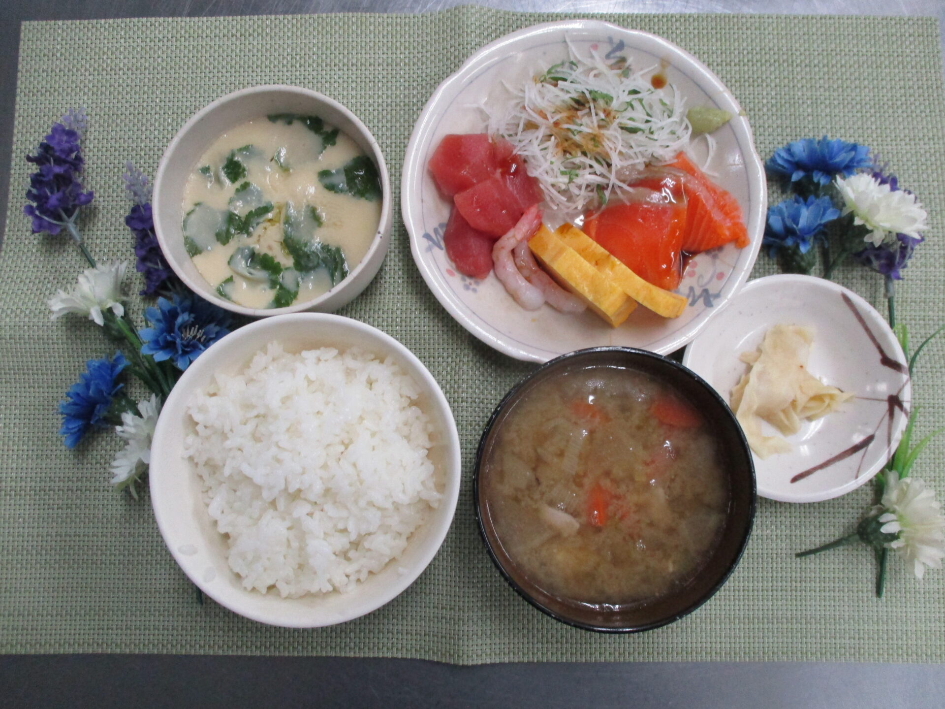 誕生会🎂 今日のランチ&おやつ♪ 2026.02.26 本日は誕生会のため、お刺身をお出ししました✨ マグロ、サーモン、甘エビ、厚焼玉子の盛り合わせです😊 おやつには手作りシベリアをお出ししました🎀 前日にカステラと水ようかんを手作りし、 カステラで水ようかんを挟み込みました♪ ★本日のランチメニュー&おやつ★ お刺身(マグロ、サーモン、甘エビ、厚焼玉子) 豚汁 茶碗蒸し 甘酢生姜 手作りシベリア