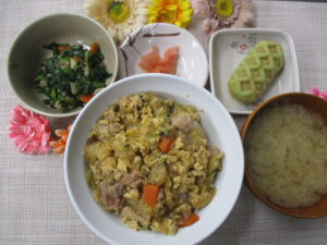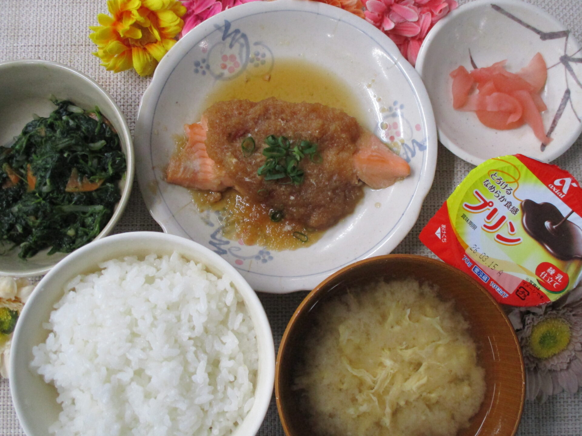 3/5鮭のみぞれ蒸し&3/6親子丼♪ 今日のランチ&おやつ♪ 2026.03.07 3/5の昼食は鮭のみぞれ蒸しでした🐟 ★3/5のランチメニュー&おやつ★ 鮭のみぞれ蒸し 味噌汁(卵、えのき) ほうれん草の三色和え物 桜つぼ漬け プリン 3/6の昼食は親子丼でした🐔 ★3/6のランチメニュー&おやつ★ 親子丼 味噌汁(玉ねぎ、しめじ) 小松菜の生姜醤油和え 桜つぼ漬け 抹茶ワッフル