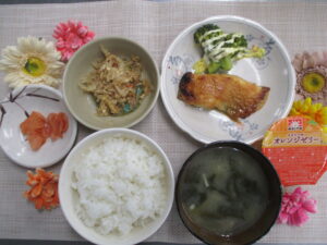 白身魚のゆずみそ焼き🐟 今日のランチ&おやつ♪ 2026.03.09 本日の昼食は白身魚のゆずみそ焼きでした😊 蒸し焼きにした魚の上にゆずみそをたっぷり 塗って焼き上げました♪ ★本日のランチメニュー&おやつ★ 白身魚のゆずみそ焼き 味噌汁(ほうれん草、えのき) もやしのゴマ酢和え 桜つぼ漬け オレンジゼリー🍊