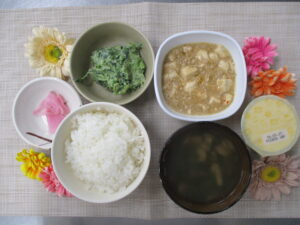 麻婆豆腐♪ 今日のランチ&おやつ♪ 2026.03.19 本日の昼食は麻婆豆腐でした😊 ピリ辛の麻婆豆腐はご飯がすすむ味付けでした✨ ★本日のランチメニュー&おやつ★ 麻婆豆腐 春雨スープ 小松菜のゴママヨ和え さくら漬け カスタードプリン🍮