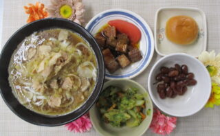 今日のランチ&おやつ♪ 肉うどん🐷 本日の昼食は肉うどんでした😊 柔らかい豚バラ肉をたっぷり入れたうどんです♪ ★本日のランチメニュー&おやつ★ 肉うどん 〈粥〉豚バラ角煮 金時煮豆 キャベツの土佐和え 薄皮クリームパン 2026.03.24 今日のランチ&おやつ♪